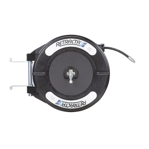RETRACTA R3 Premium spring rewind reel c/w 15m x 1/4″ Grease hose, 1/4″ BSPF inlet fitting and 1/4″ BSPT M hose end. Black case.