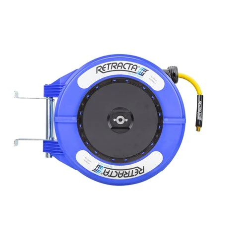 RETRACTA R3 Premium spring rewind reel c/w 20m x 3/8″ Retracta-Flex Yellow hose, 3/8″ BSPF inlet fitting and 1/4″ BSPT M hose end. Blue case.