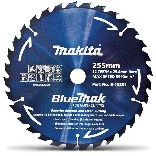MAKITA® BLUEMAK® Circular Saw Blades feature a blue coating which resists “pitch” build-up and reduces friction during cutting. It also has an added advantage of eliminating corrosion.