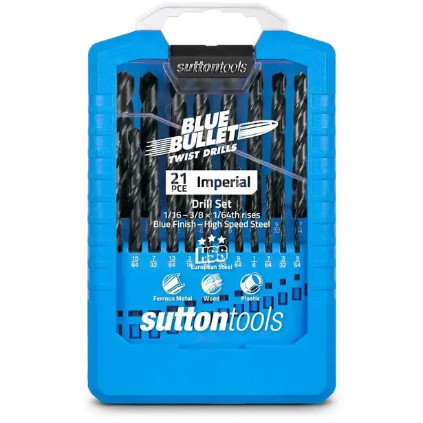 SUTTON TOOLS® BLUE BULLET™ Jobber Drills are a general purpose drill bit designed for machine and hand hald drilling of ferrous metals. The blue finish reduces chip build-up on the cutting edge and is a better choice when drilling ferrous metals.