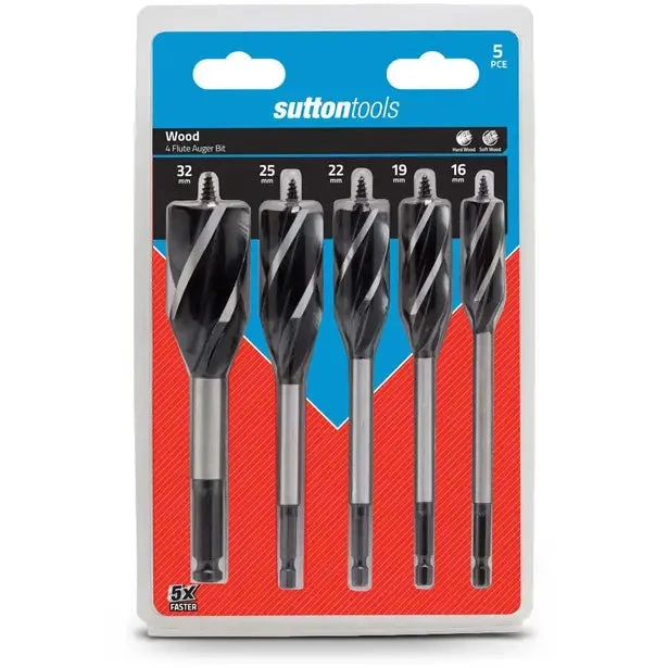 SUTTON TOOLS® 4-Flute Auger Bits are designed for machine and hand drilling into hard and soft wood. Their four cutting edges make drilling up to 5 times faster than traditional spade bits.