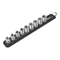 Typically Wera designed robust textile belt with 9 sockets taking up minimal space. A smooth turning Twist to Unlock mechanism ensures a secure fit and simple removal of the sockets. Comes with “”Take it easy”” Tool Finder with colour coding according to size to enable the right tool to be selected easily and quickly. Includes a snap hook for secure fastening to a belt loop or pocket. Supplied with a nonwoven reverse side and hook and loop strips for simple attachment e.g. to a wall, shelf, tool trolley and to the Wera 2go tool transport system.