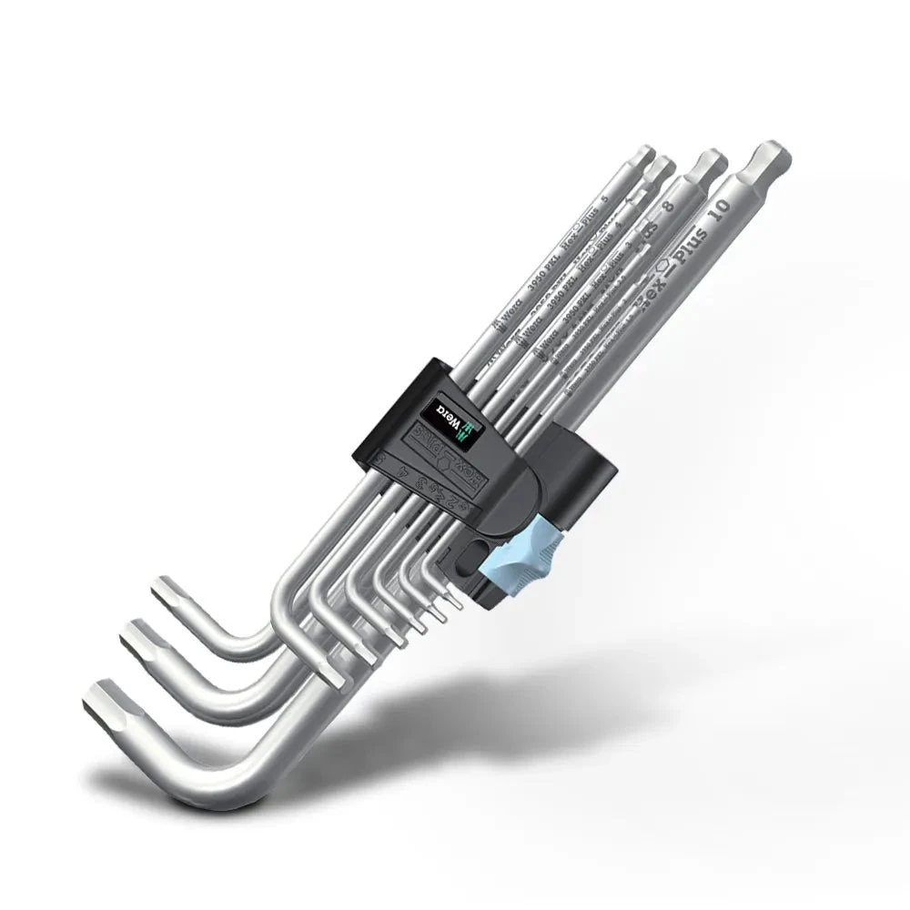 The Hex-Plus profile offers a greater contact surface in the head of the screw. The notching effect is therefore reduced to a minimum and damage to the screw head is more or less eliminated. Come with hex ballpoint on the long arm: the ballpoint drive profile means that it is possible to swivel the tool axis away from the screwdriving axis, thus enabling “round the corner” screwdriving. In an almost wear-free L-key clip fastener.