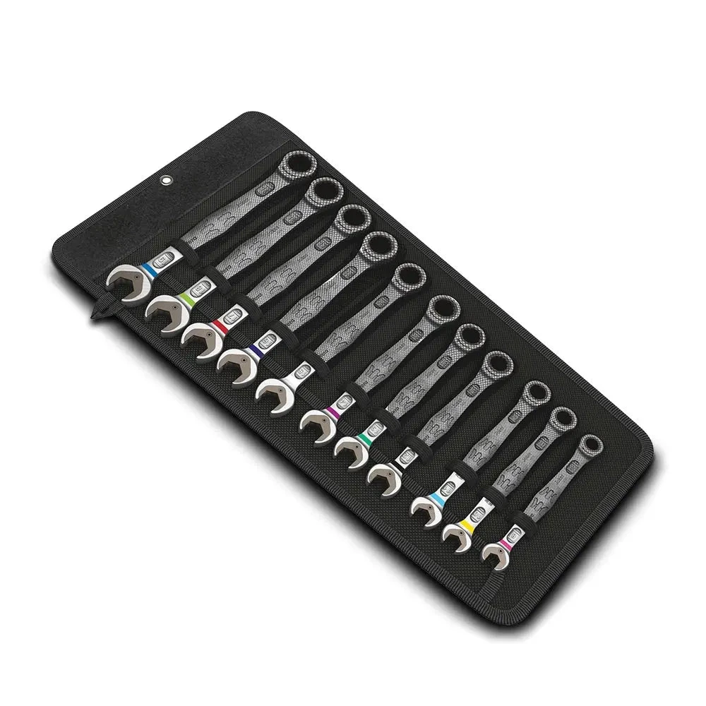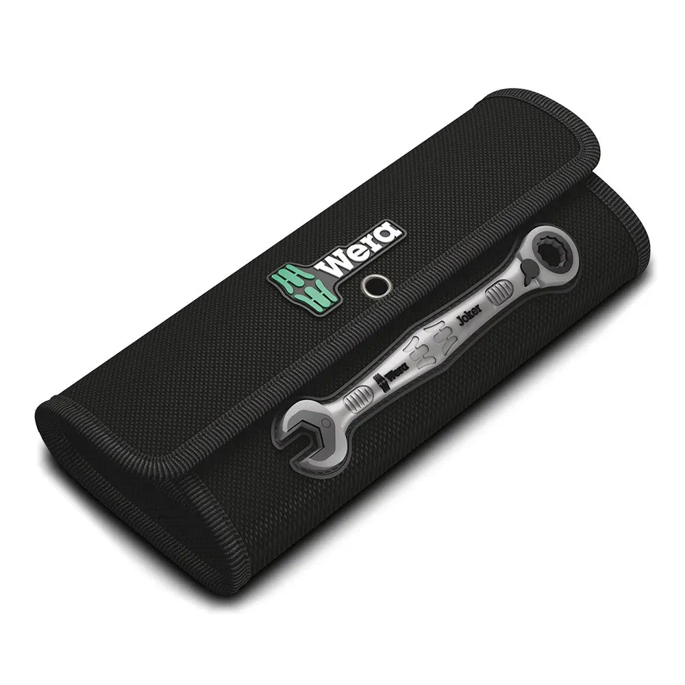 High quality combination ratchet wrench set by Wera: everything that a wrench has to be able to do. And a whole lot more. Faster, better, stylish. Yes, a real Joker. The new generation of combination ratchet wrenches. 11-piece set in a robust pouch. Suitable for hexagon bolt heads or nuts. Comes with a holding function, thanks to the metal plate in the jaw, which reduces the risk of dropping nuts and bolts. The replaceable metal plate in the jaw secures nuts and bolts with its extra hard teeth and limits the danger of slipping. The integrated limit stop prevents any slipping down around the bolt head and allows higher torque to be applied.