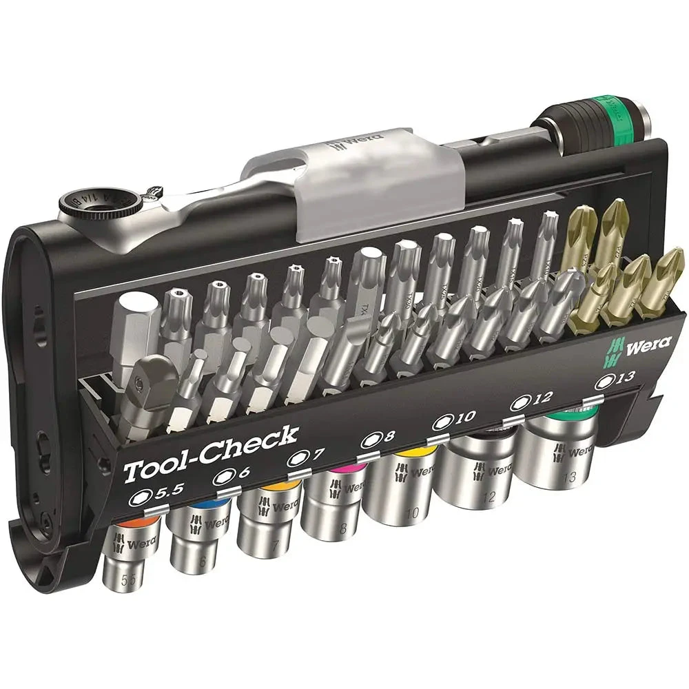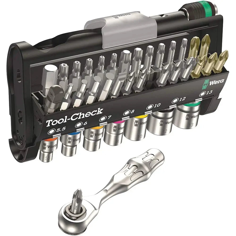 Ratchet, bits and sockets in a minimum of space – as compact as it gets. Comes with a practical clip for attachment e.g. to the belt so the Tool-Check is always at hand even for mobile applications. Simple operation, even with just one hand, in confined working spaces. Drop-forged, full-steel design and fine-pitched mechanism with 60 teeth that allows a small return angle of 6° for precise working. Easy left/right switchover. Ergonomically designed ratchet head and lever. Suitable for ¼” bit and socket take-up. The use of ¼” sockets is also possible with the Wera adaptor 870/1. Tough viscous bits for universal use. Manual and power tool socket insert (ISO 2725-Part 3) by Wera allows applications both in manual as well as power tools. “Take it easy” Tool Finder with colour coding according to size – for simple and rapid accessing of the required tool. Featuring a good grip to allow easy pick-up even with oily hands. Ball stop groove, for hex head bolts and nuts; chrome vanadium steel, matt chrome-plated.