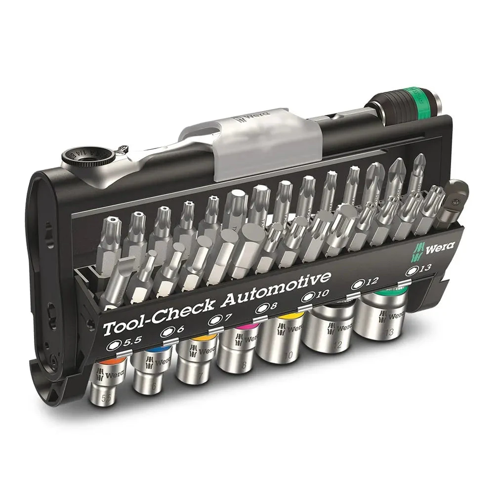 Suitable for ¼” bit and socket take-up. The use of ¼” sockets is also possible with the Wera adaptor 870/1. Tough viscous bits for universal use. Manual and power tool socket insert (ISO 2725-Part 3) by Wera allows applications both in the manual as well as power tools. “Take it easy” Tool Finder with colour coding according to size – for simple and rapid accessing of the required tool. Featuring a good grip to allow easy pick-up even with oily hands. Ball stop groove, for hex head bolts and nuts; chrome vanadium steel, matt chrome-plated.